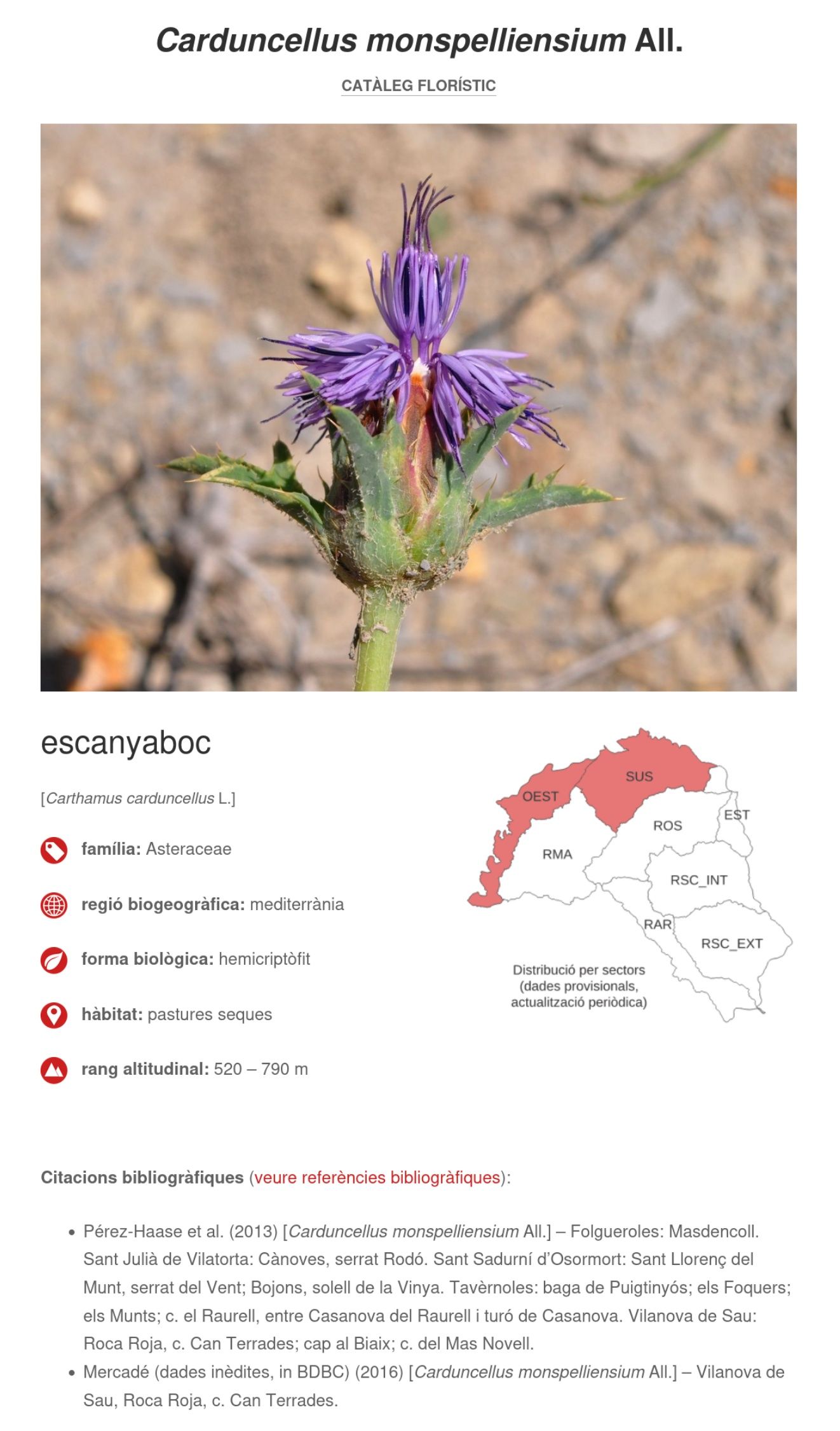 - Regió biogeogràfica segons la proposta de Bolòs et al., 2005 (Bolòs, O., Vigo, J., Masalles, R. M. & Ninot, J. M. 2005. Flora manual dels Països Catalans, 3a ed. Pòrtic, Barcelona). En el cas de les plantes introduïdes s’indica la regió d’origen seguint principalment POWO (Plants of the World Online).