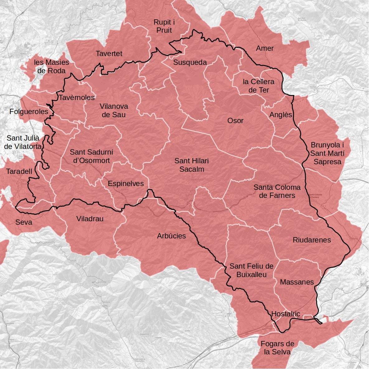El territori abasta 26 municipis de dues comarques (la Selva i Osona), per bé que molt d’ells només hi inclouen una petita part del seu terme. Els municipis que hi tenen una extensió més gran són els de Sant Hilari Sacalm, Vilanova de Sau, Santa Coloma de Farners, Osor, Sant Feliu de Buixalleu, Susqueda, Riudarenes, Sant Sadurní d’Osormort, Arbúcies i Massanes, cascun d’ells amb més de 25 km2 dins del massís.