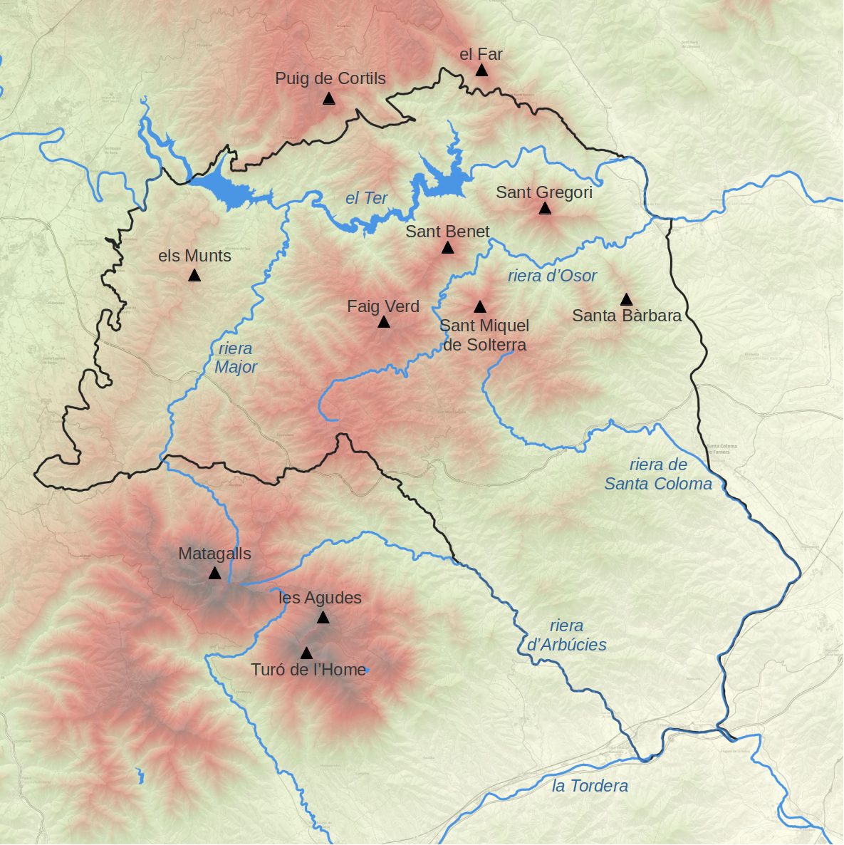El territori és muntanyós, amb altituds que van des dels 40 m sobre el nivell del mar a l’extrem sud-oriental (a l’aiguabarreig de la riera de Santa Coloma amb la Tordera) fins als 1.202 m del cim de Sant Miquel de Solterra. A banda d’aquest cim hi ha un seguit d’altres elevacions que depassen els 1.000 m tot resseguint la divisòria d’aigües entre les valls del Ter i de la riera d’Osor: el turó del Faig Verd (1.187 m), la muntanya de la Coma (1.146 m), Sant Benet (1.147 m), Sant Gregori (1.094 m), etc. Destaquen també altres carenes importants com ara les de Santa Bàrbara, del Corb o de Roca Guillera (a la banda nord-oriental) o les de la Guàrdia, els Munts o Mondois (al sector nord-occidental).